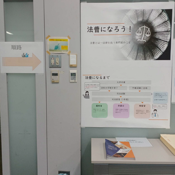 その法科大学院入学から晴れて司法試験に合格し、法曹になるための過程を順番に詳しく説明したパネルや司法試験クイズなど多岐にわたって展示しました。